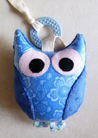 This is all the toys. Each one has a rattle or a bell inside. The owl is the one that can be attached to the pram. The balls are hexagons that I hand stitched together. They are attache to teething rings as well.